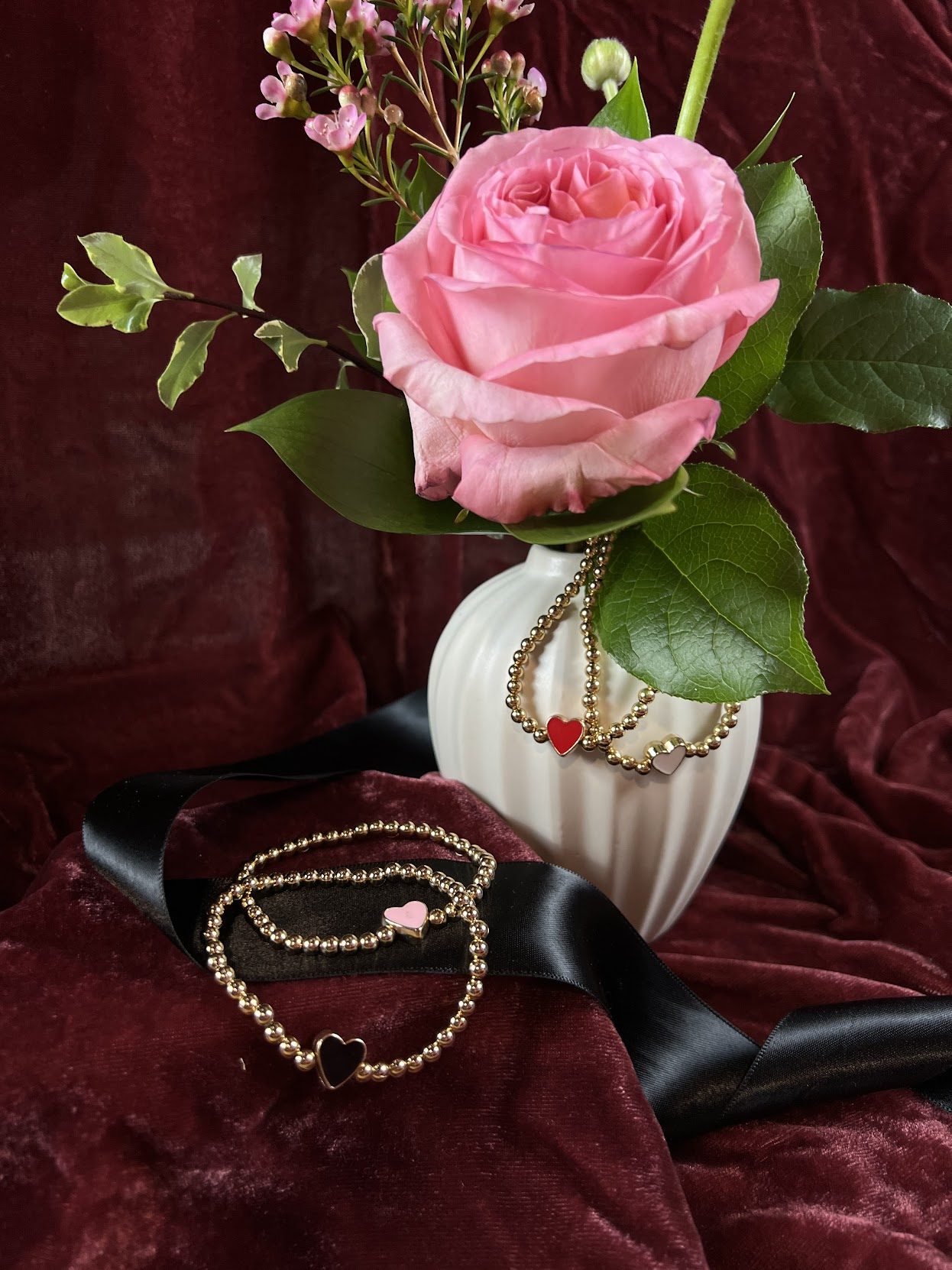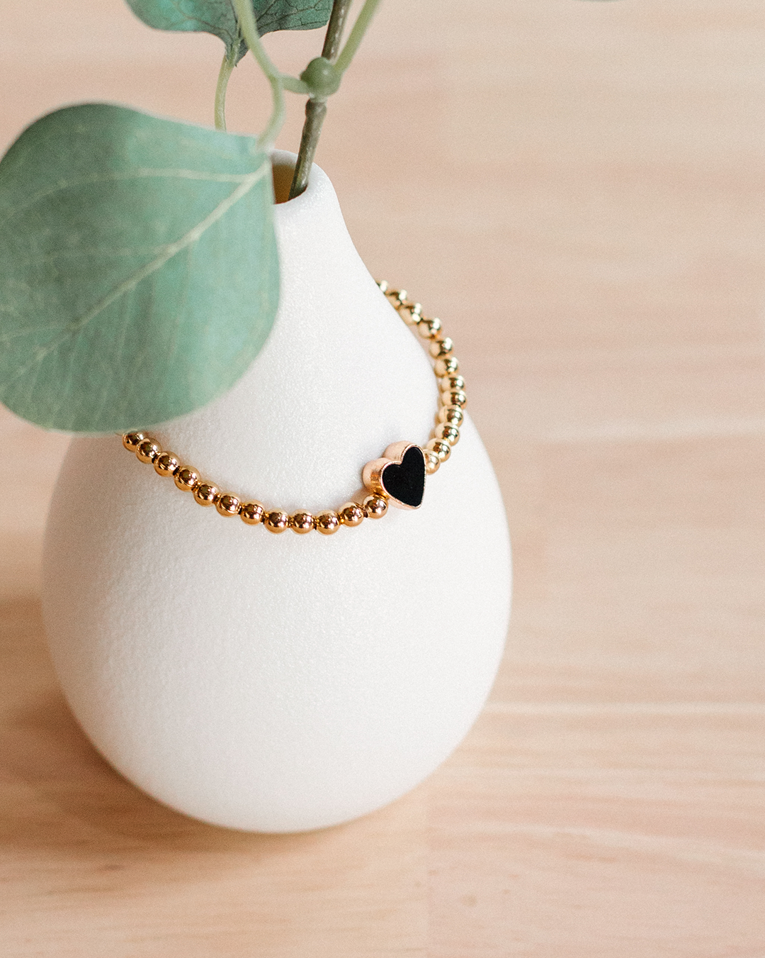 Made with 4mm gold plated beads and your choice of a red, white, pink, or black heart, this bracelet adds a subtle pop of color with a simple heart detail. Designed as a stretch bracelet with a 6.75 inch fit, it is comfortable for everyday wear and perfect for gifting.