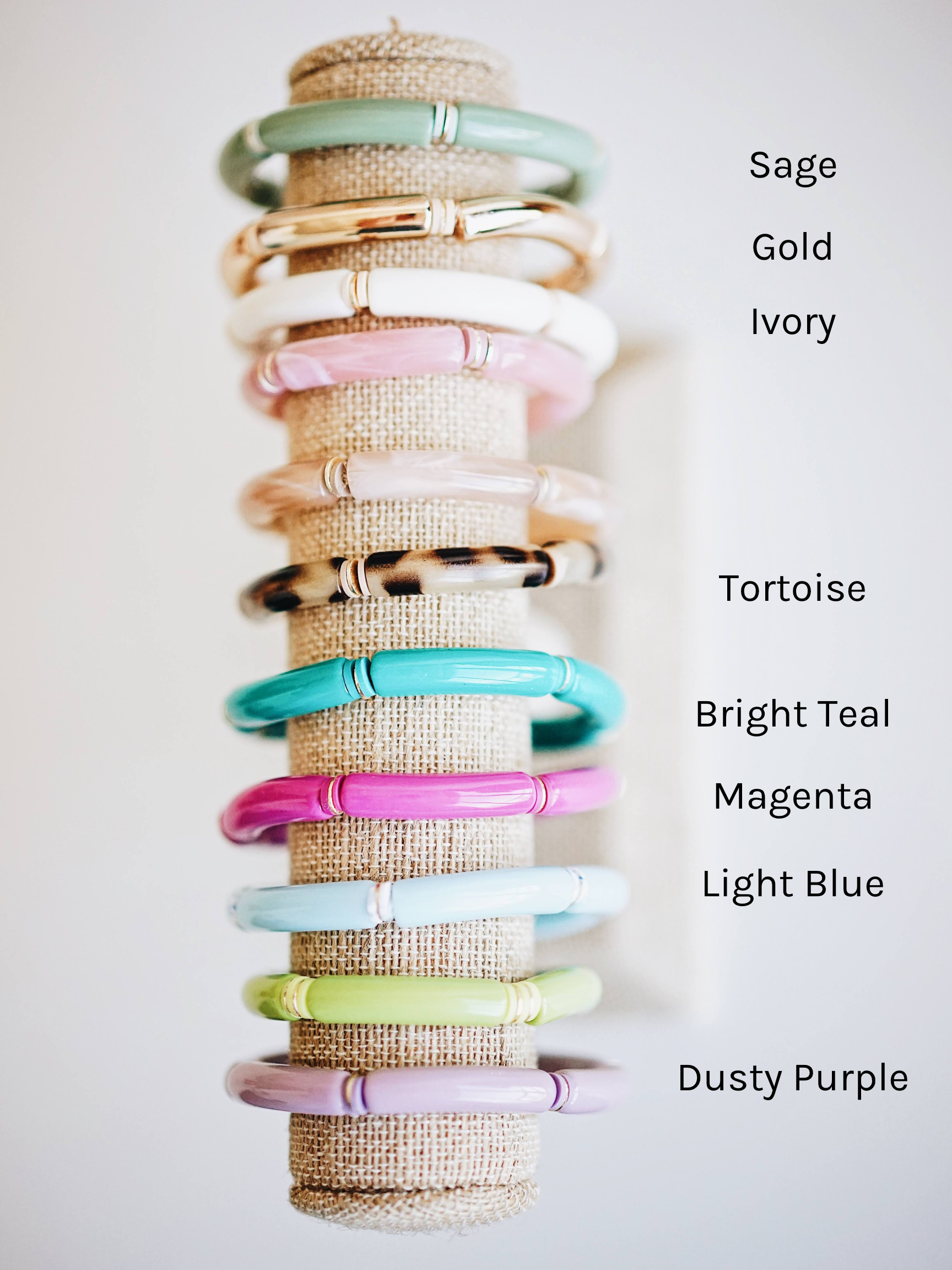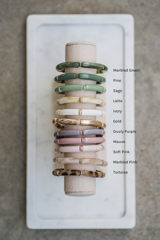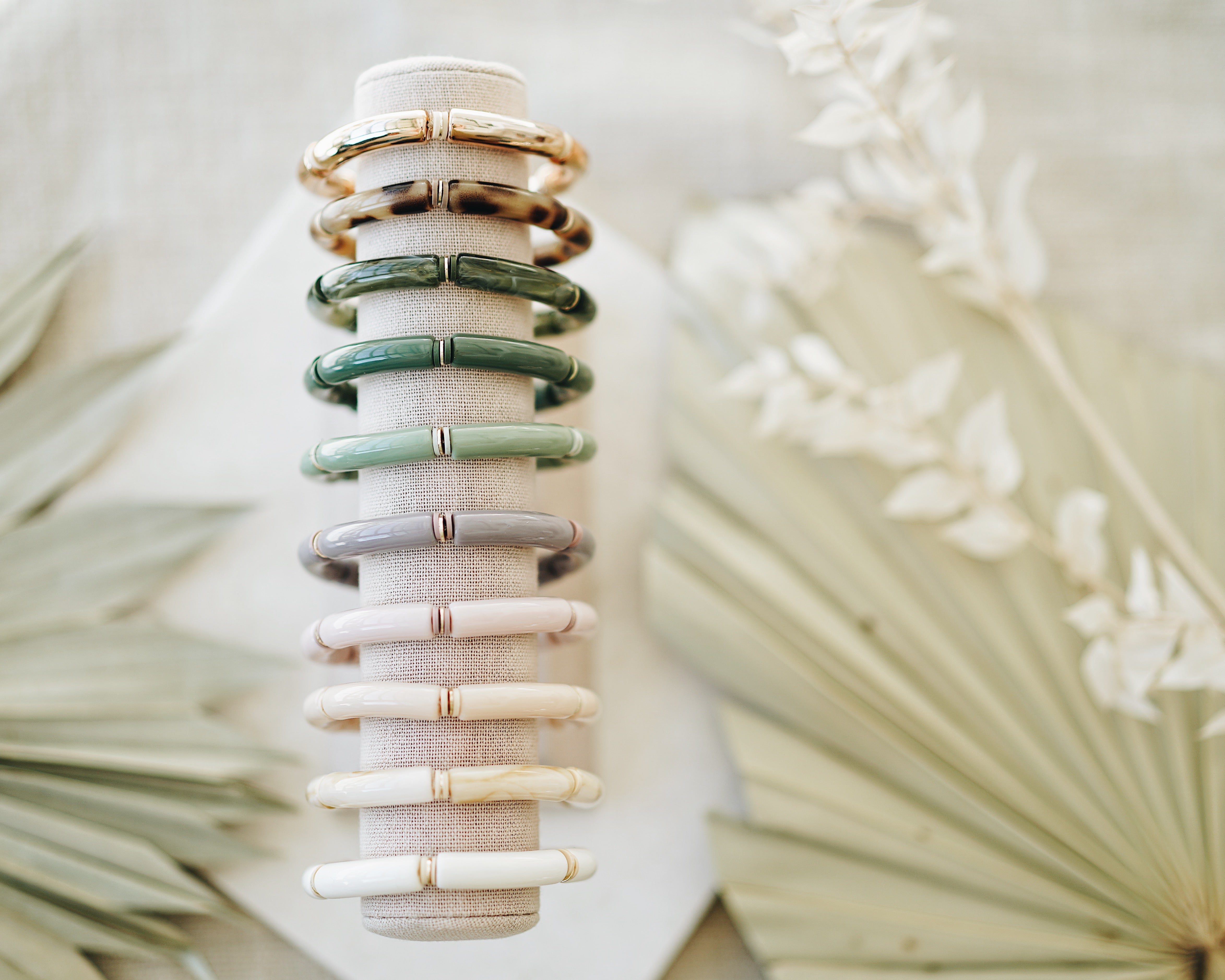 Crafted with a lightweight yet durable design, each bangle has a subtle gold accent at the joints, offering a polished finish and refined detail. Available in a variety of serene, nature-inspired hues—from creamy ivory and soft blush to sage green and tortoise shell—there’s a shade for every mood and outfit.