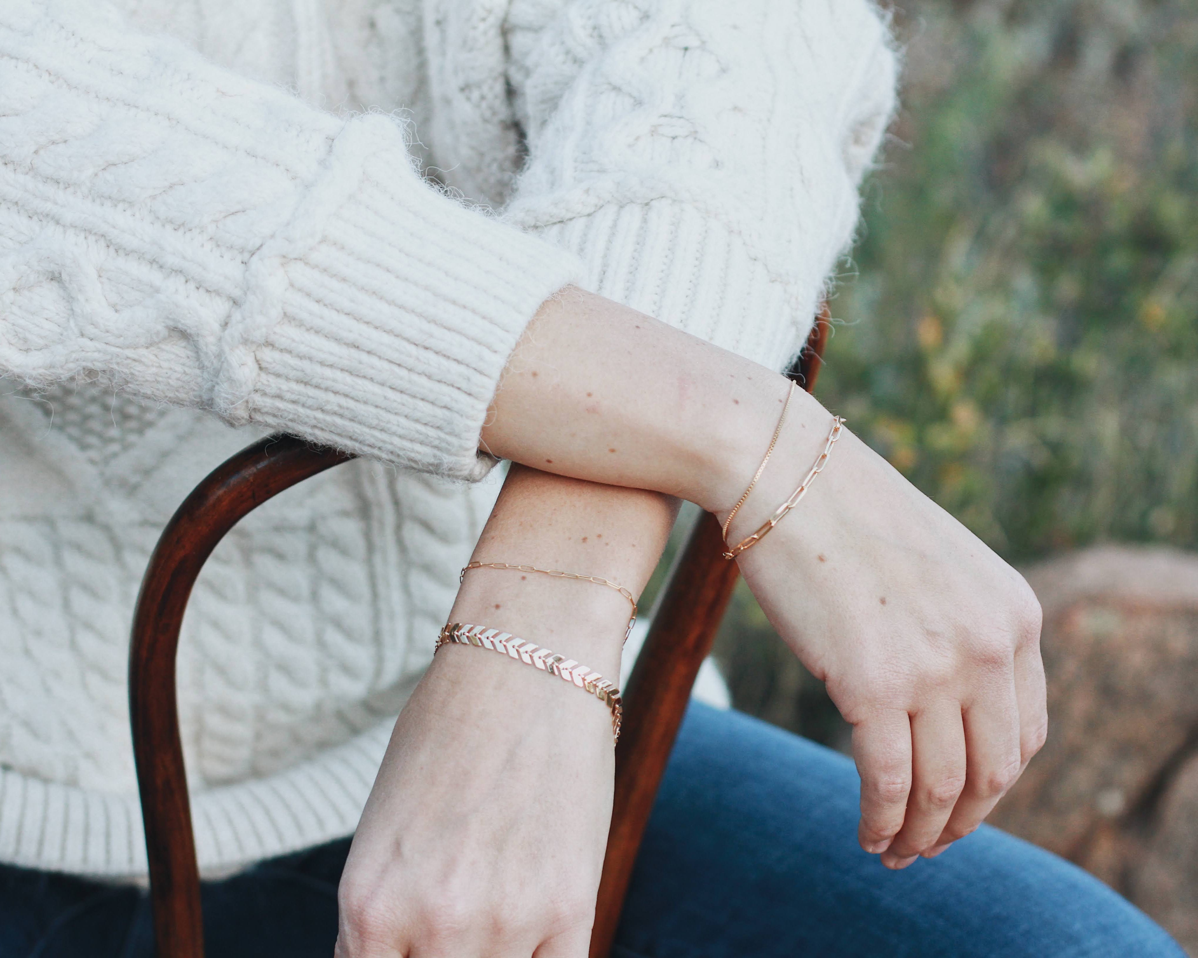 Our Herringbone bracelet is simple, delicate and timeless. Perfect for layering. Part of our Amalfi Collection, these all gold pieces are inspired by sunbathing and dining on the coast of Italy.