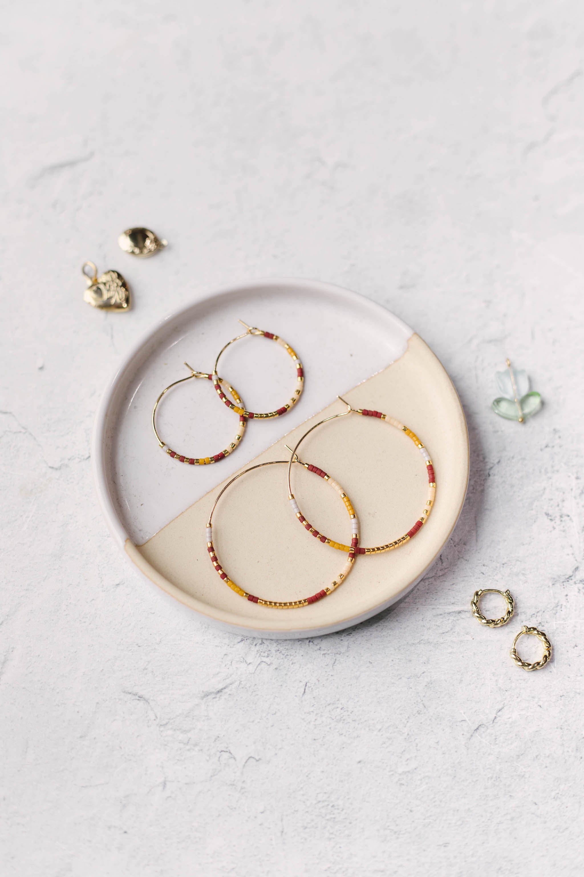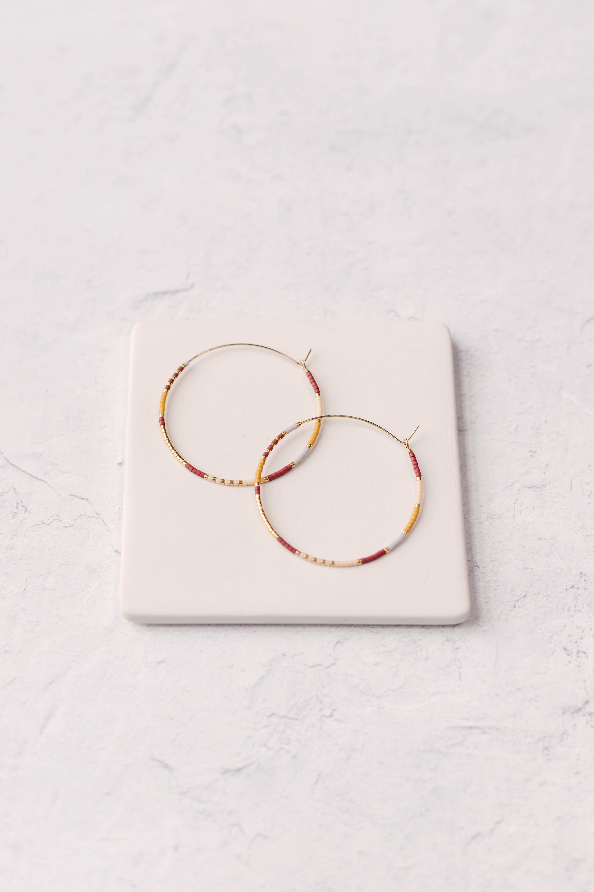 These lightweight, gold filled hoops are made with gold, cream, gray, mustard yellow and maroon delica beads.