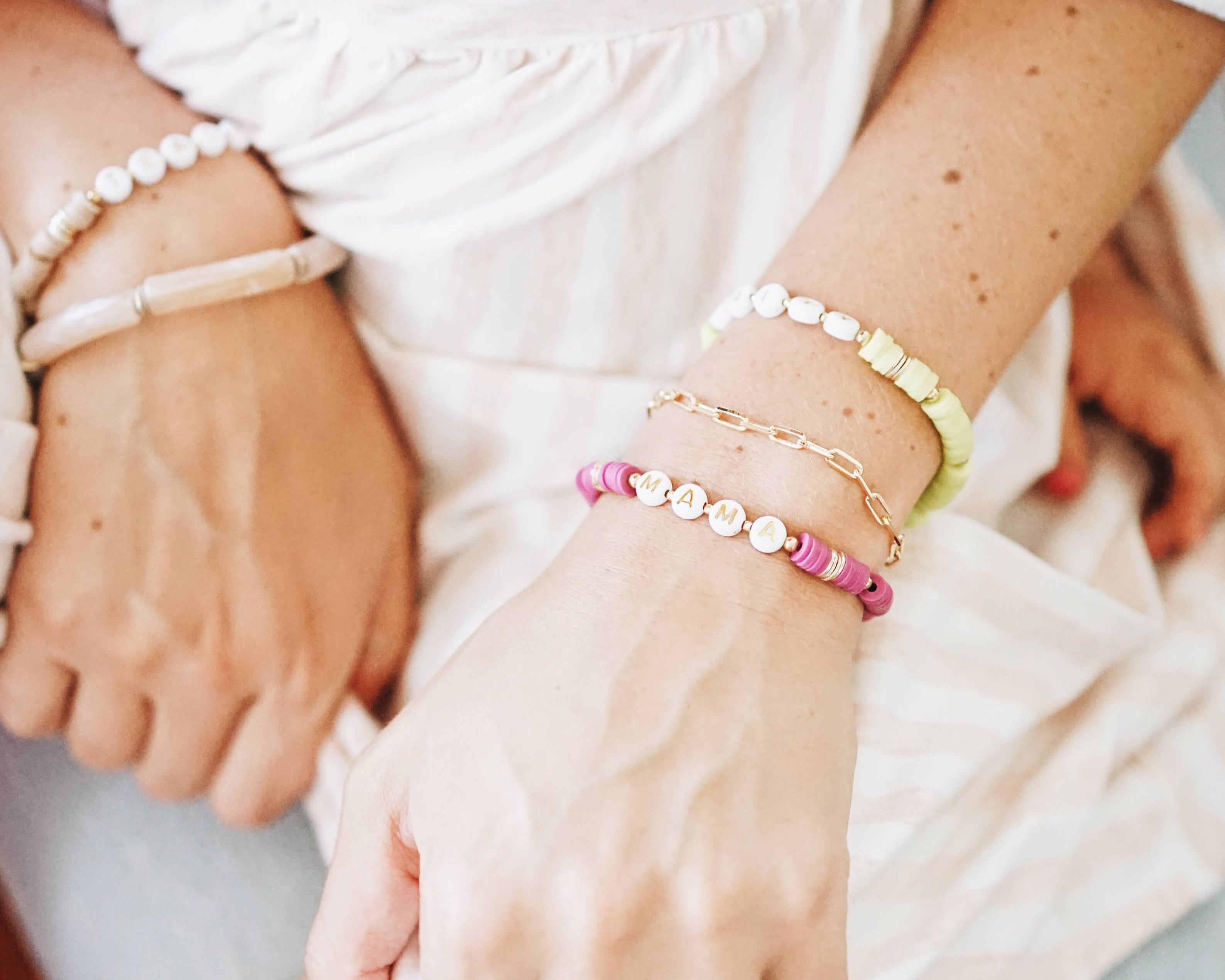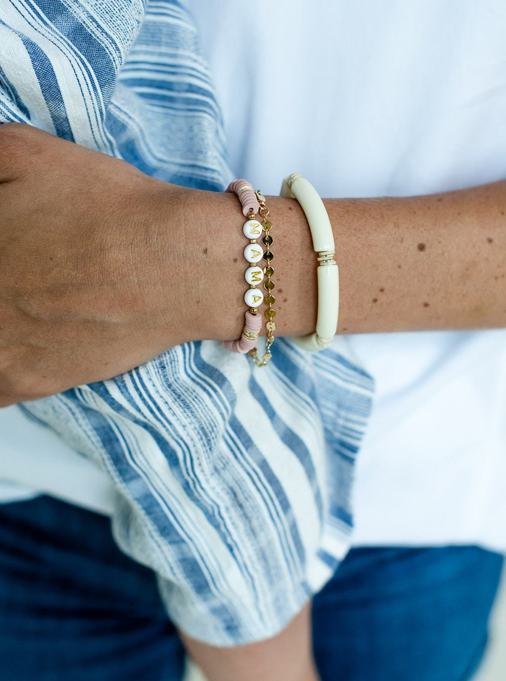 Our MAMA heishi beaded bracelet is perfect for everyday wear! Casual and lightweight, it can be dressed up or dressed down.