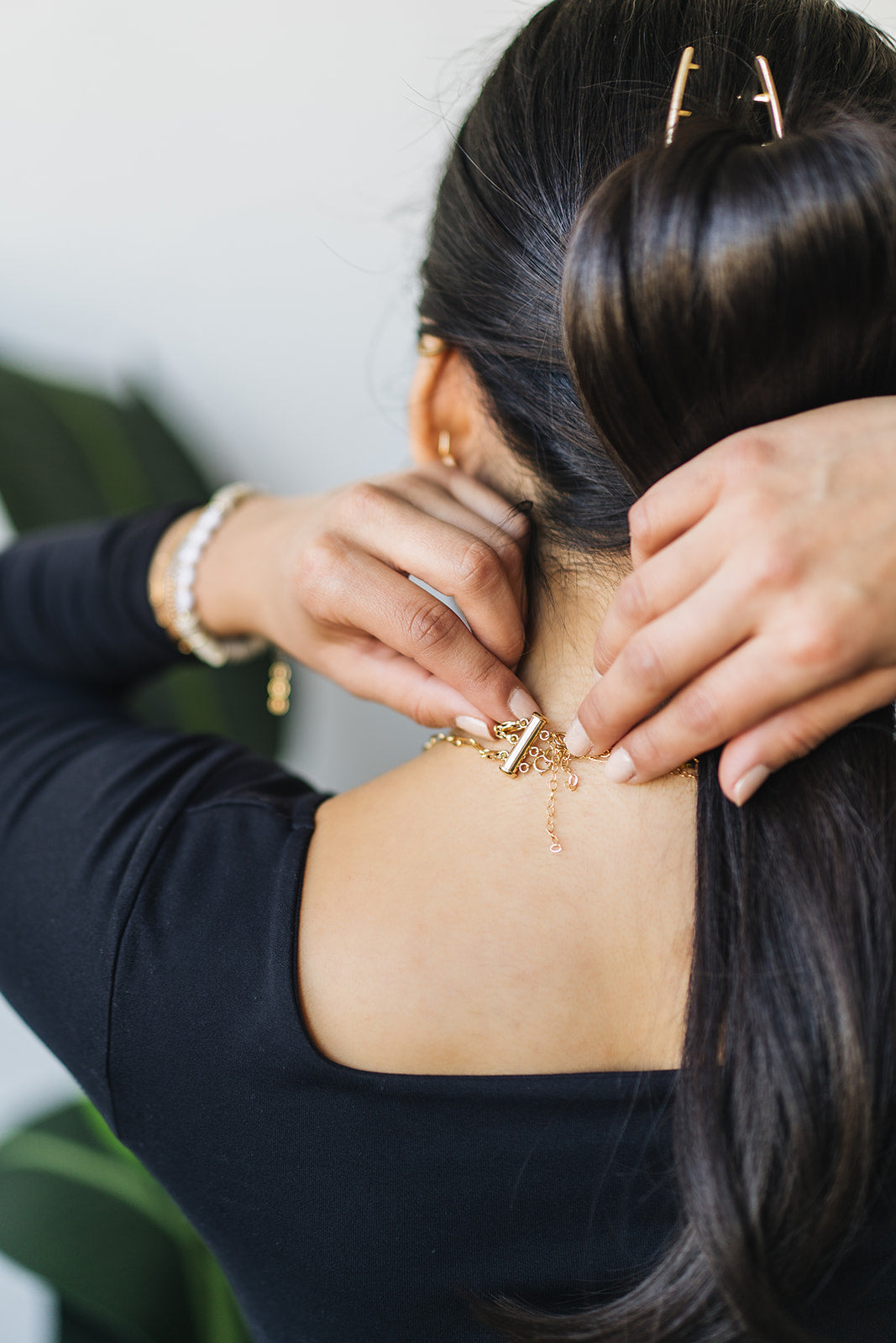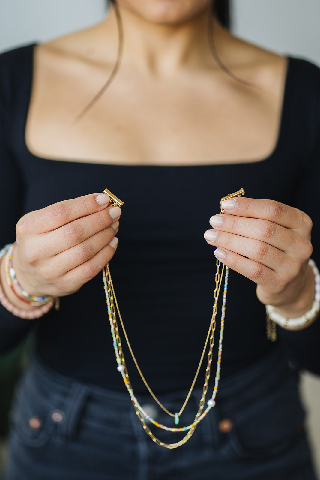 Our necklace layering clasp is great for layering any size necklace without tangling. Wear up to three necklaces at once.