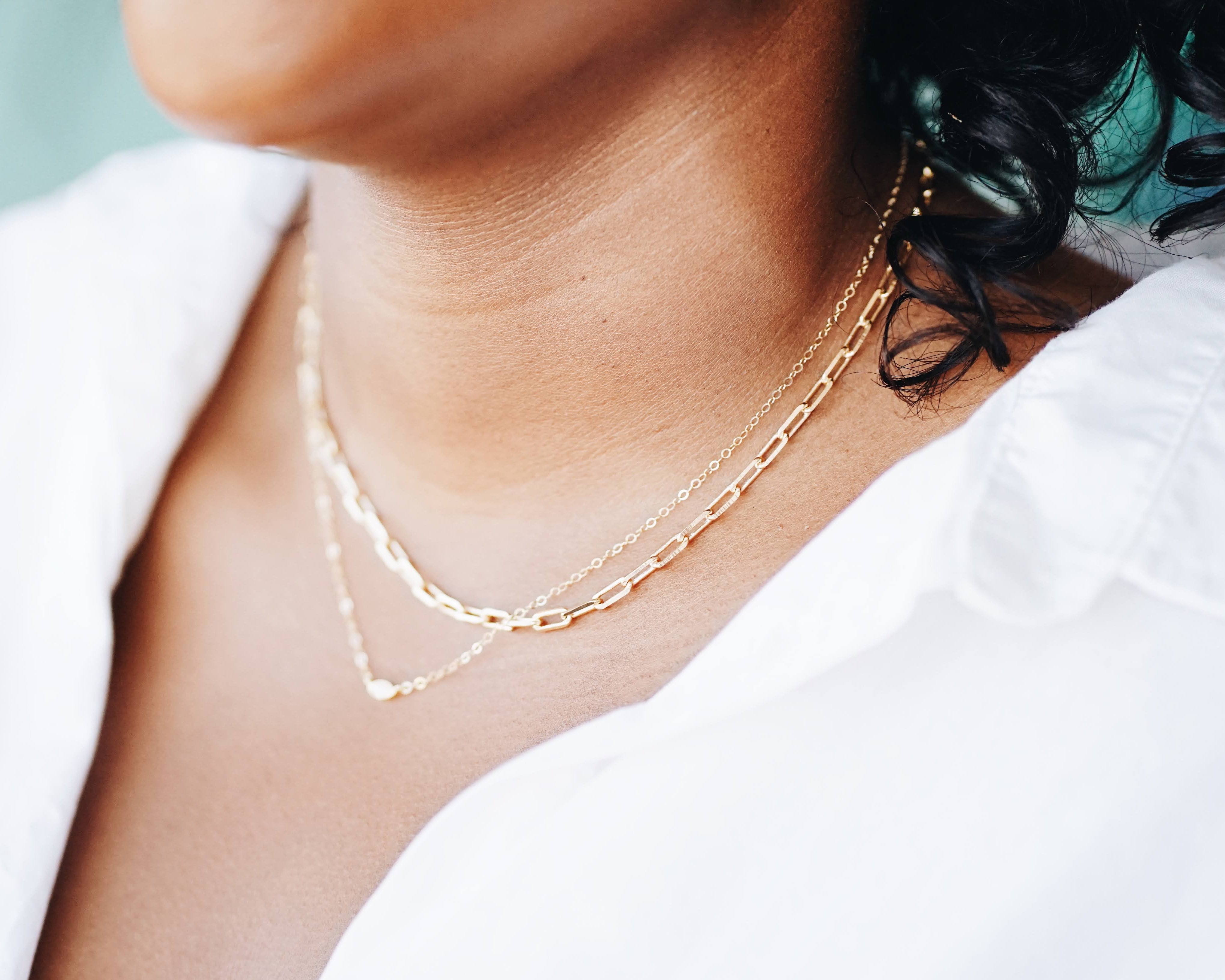 This necklace is made of gold filled paperclip chain and comes with a 14K gold filled lobster clasp and a two inch extender to ensure a secure fit.