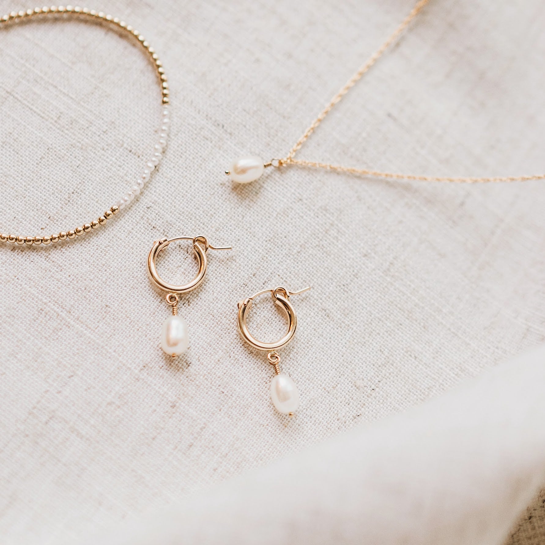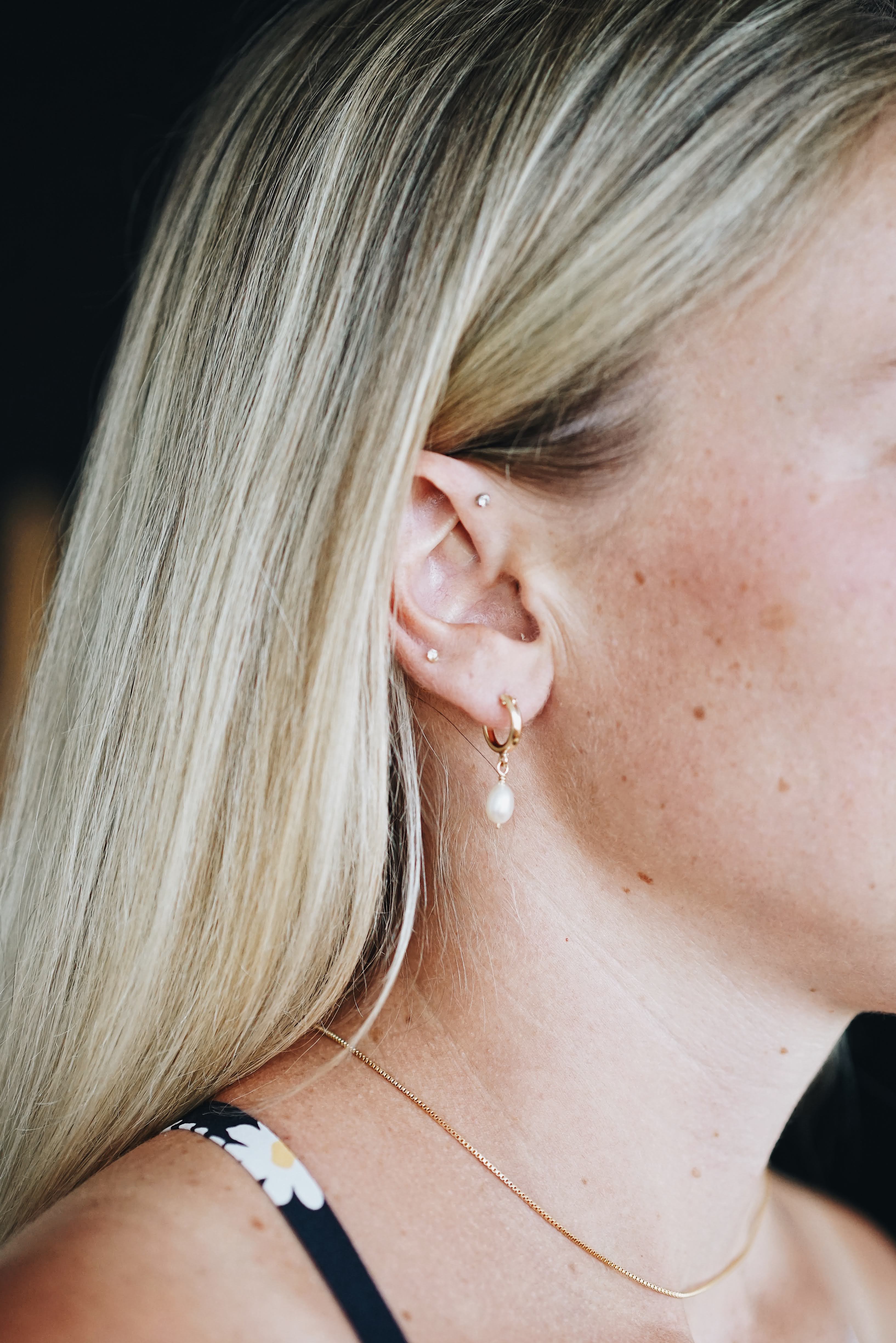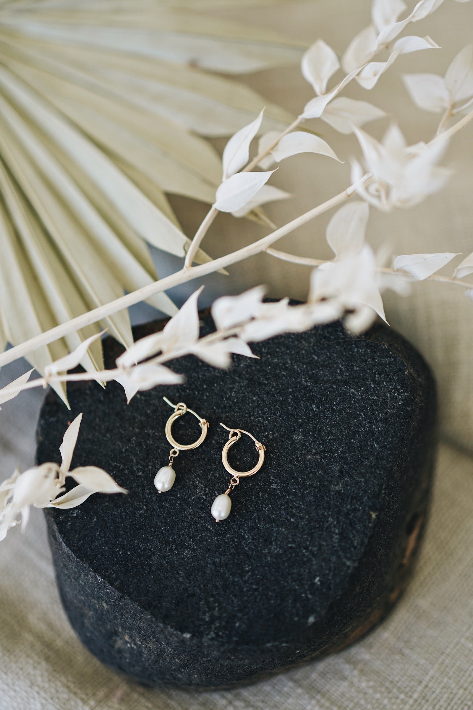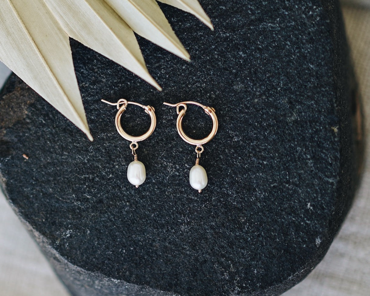 Our pearl drop huggies are the perfect way to elevate your holiday outfits! 18k gold filled hoop with hinge closure and a fresh water pearl charm.