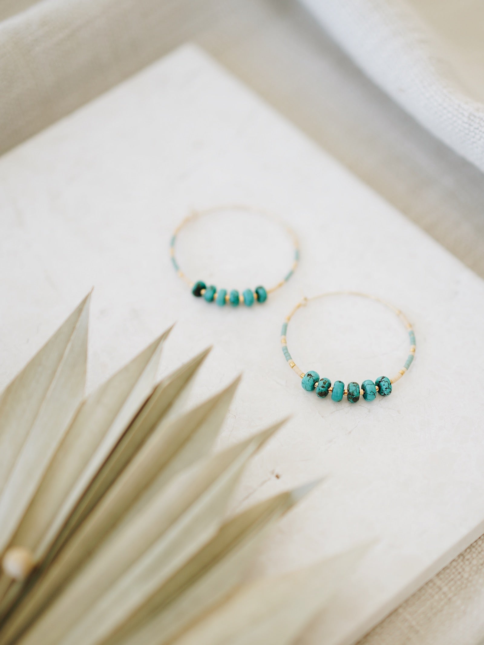 Our Turquoise Rondelle hoop is one of our best sellers! Inspired by the colors of the Southwest, they are lightweight and perfect for everyday wear. The beautiful turquoise color lets you dress them up or down.