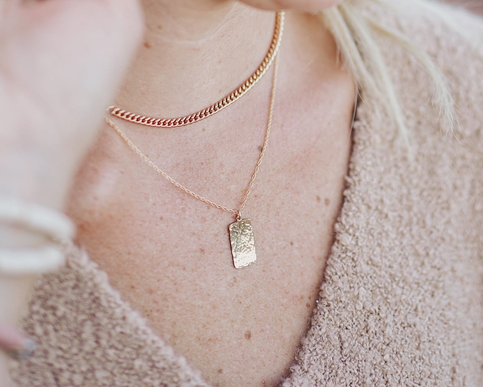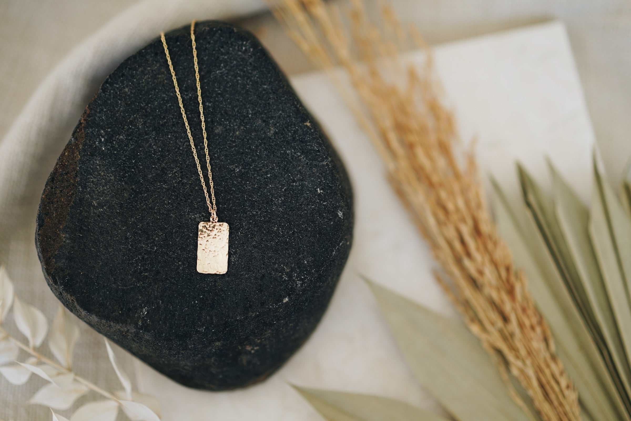 Our Hammered Plate necklace is made with a beautiful gold filled braided chain and a small hammered tag charm (charm is 18mm x 10mm).