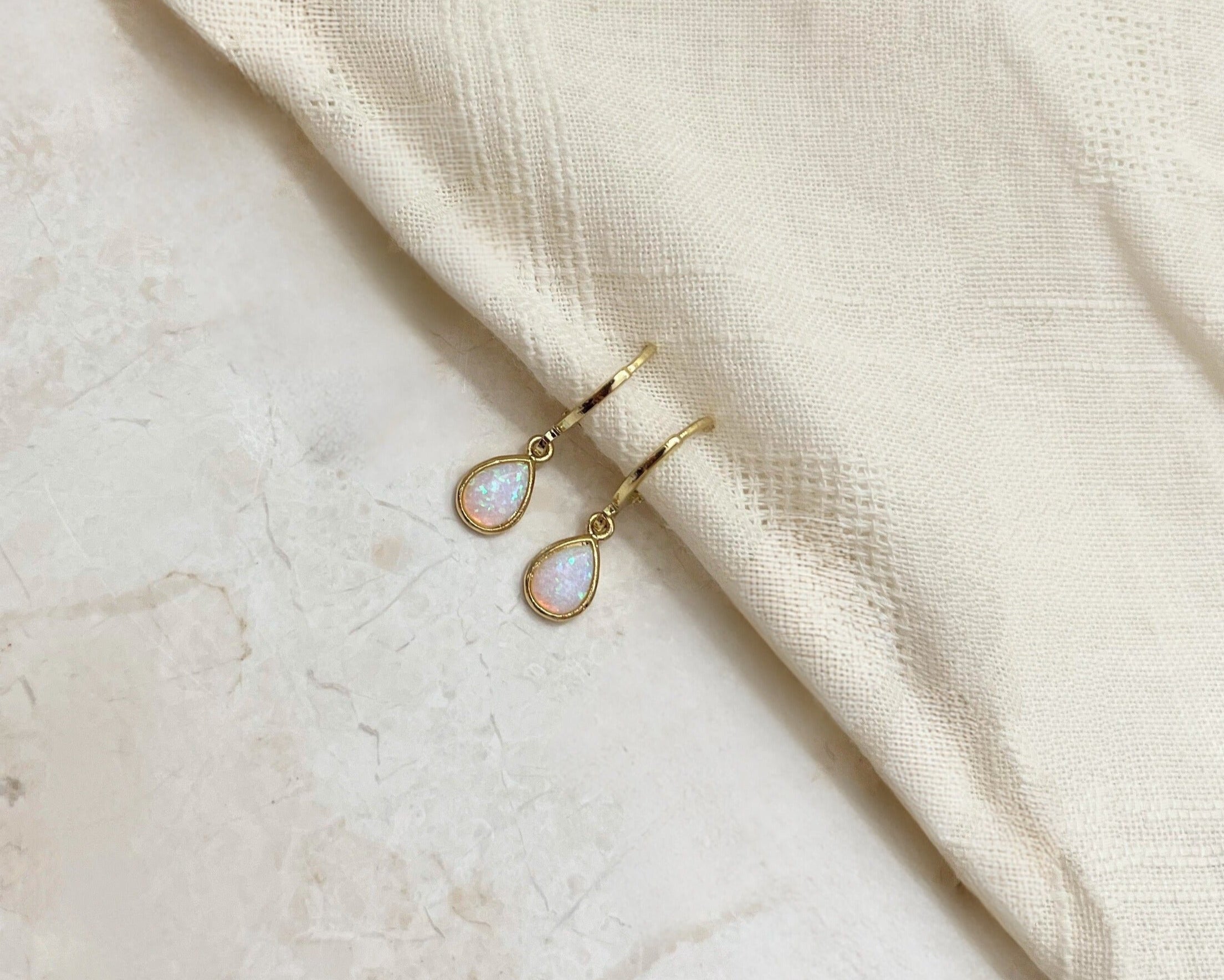 Our lightweight huggie earrings are the perfect everyday look. The 18k gold plated huggies fit close to your ear with an opal teardrop charm. Leverback closure for a tight fit.