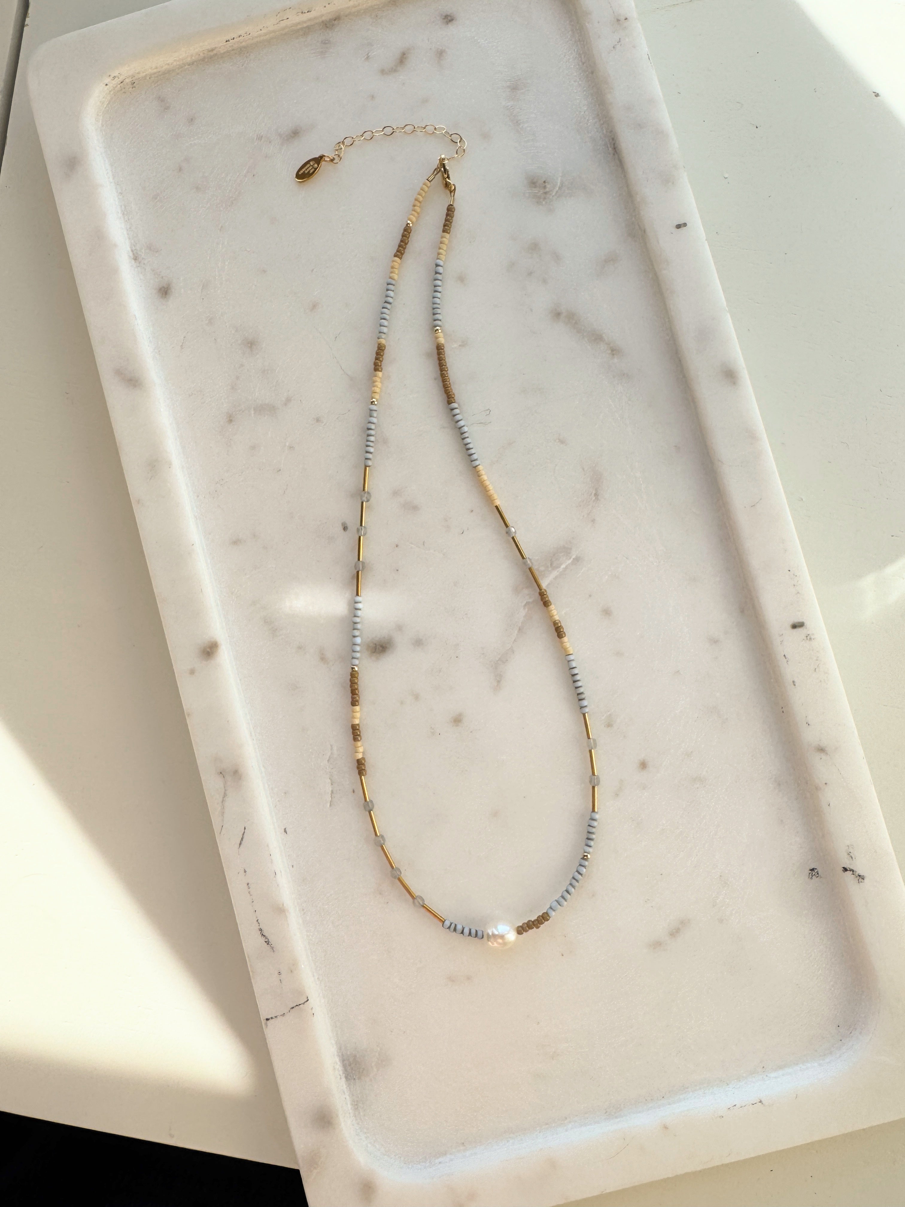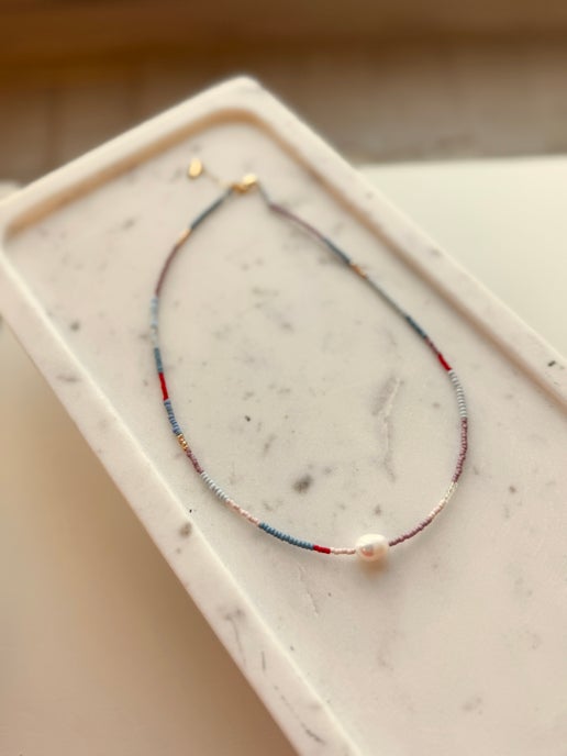 These necklaces have a fresh water pearl centered between a unique blend of vintage and glass beads with gold filled accents. All of our beads are hand picked and curated to each unique necklace. While each color palette follows a similar pattern, each necklace is one-of-a-kind and slight variations in the design are to be expected.