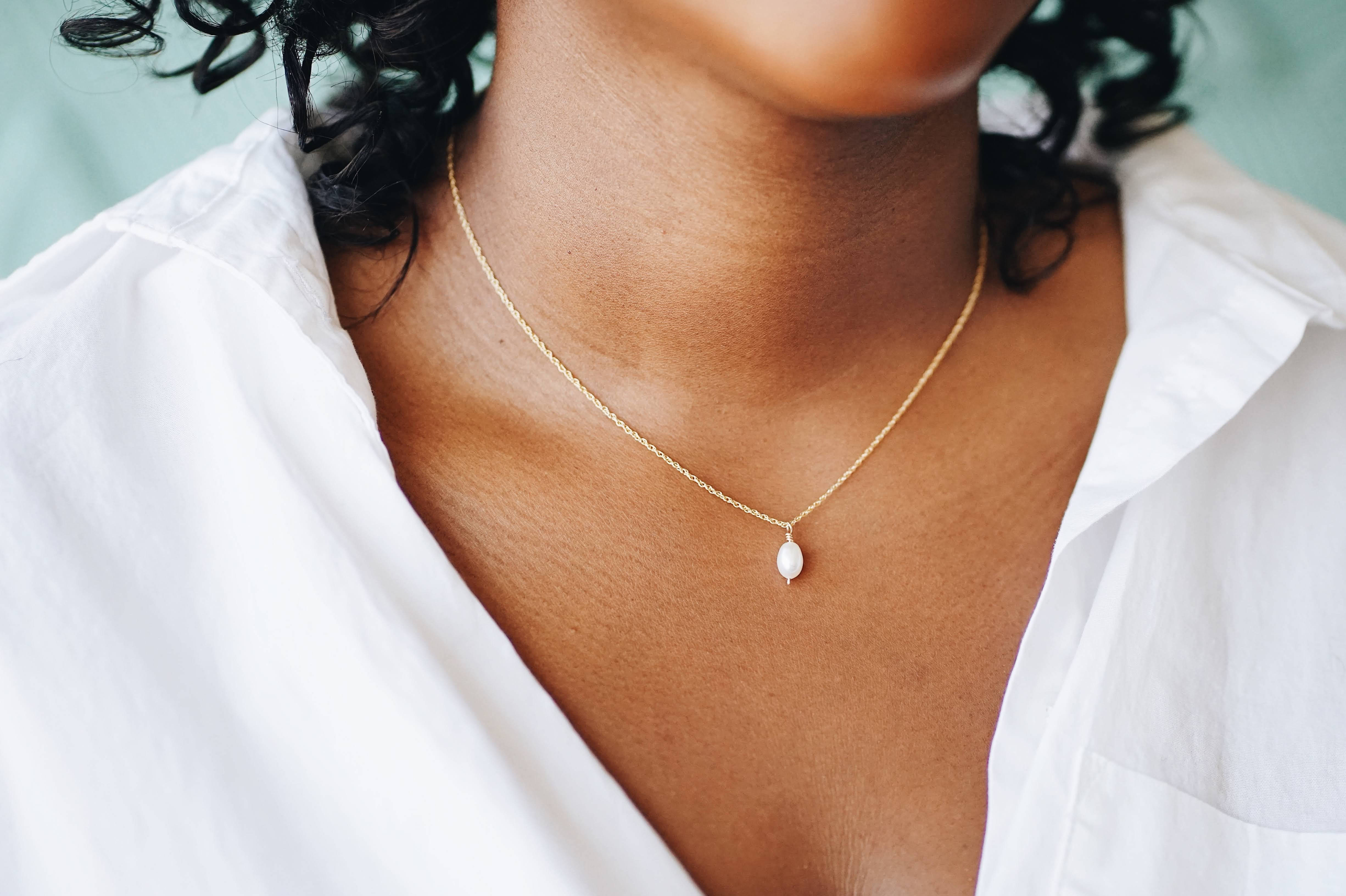 Our Drop Pearl necklace is made with a single genuine freshwater pearl, on a delicate 18k gold filled rope chain. This necklace closes with a 14K gold filled lobster clasp to ensure a secure fit.